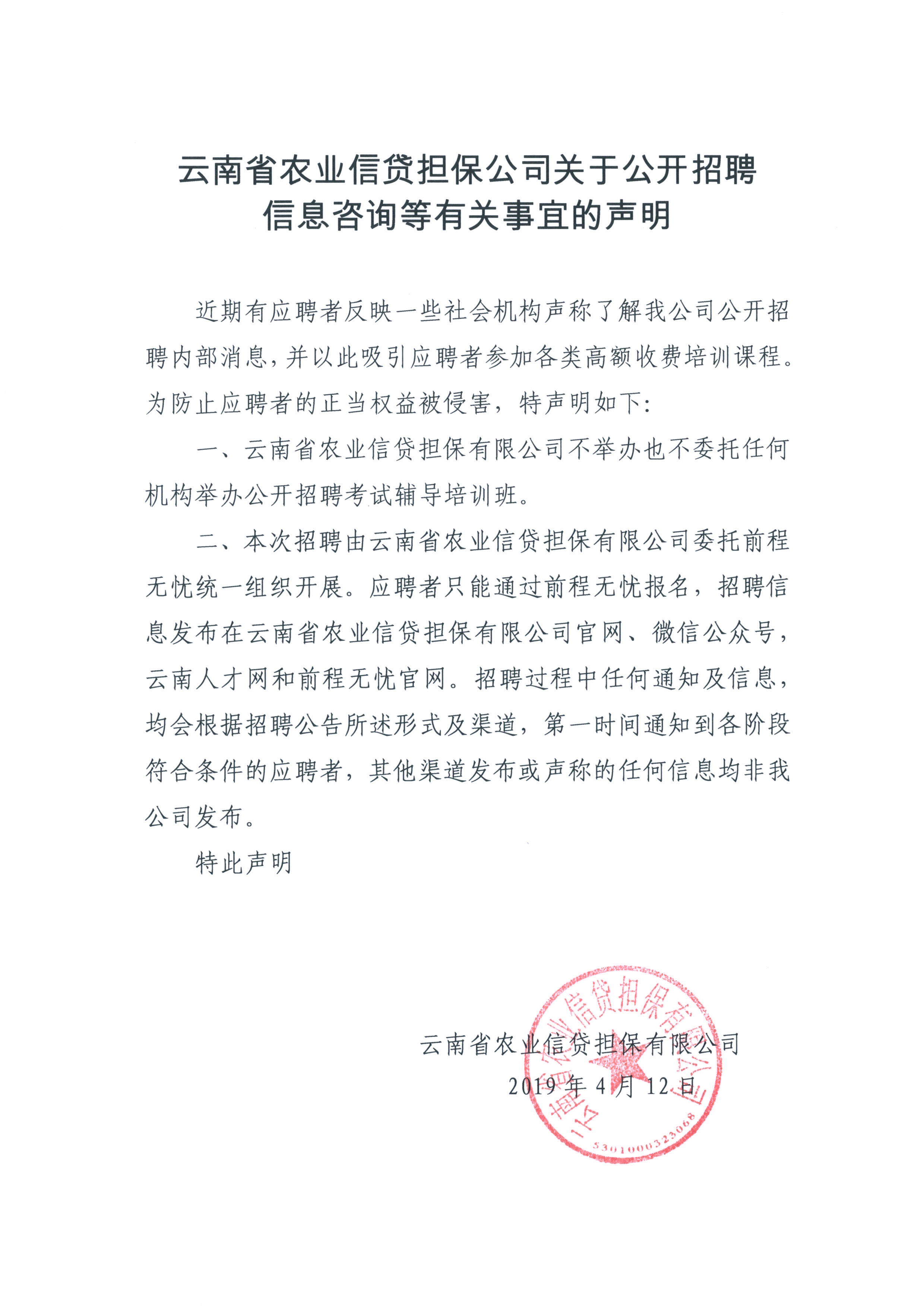 云南省農(nóng)業(yè)信貸擔(dān)保有限公司關(guān)于公開招聘信息咨詢等有關(guān)事宜的聲明