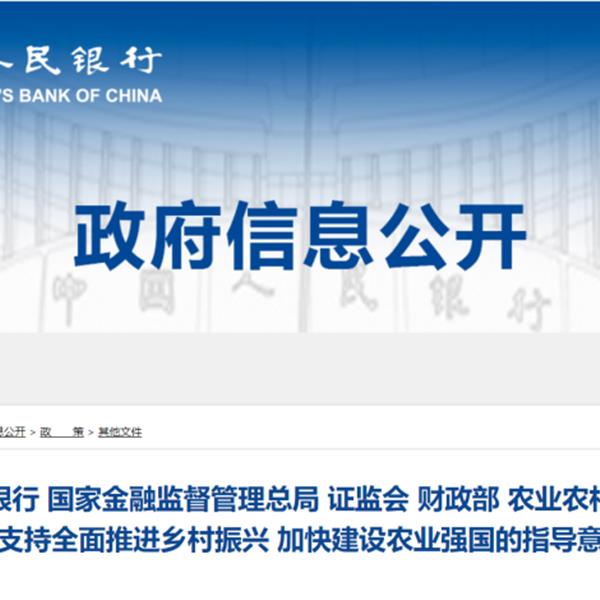 中國人民銀行、金融監(jiān)管總局、中國證監(jiān)會、財政部、農(nóng)業(yè)農(nóng)村部近日聯(lián)合發(fā)布《關(guān)于金融支持全面推進(jìn)鄉(xiāng)村振興 加快建設(shè)農(nóng)業(yè)強(qiáng)國的指導(dǎo)意見》。